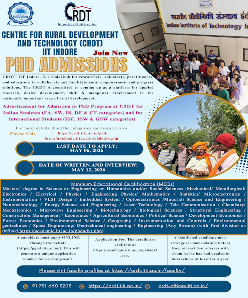 IIT Indore is the premier technology institute in Central India and is located in Indore, Madhya Pradesh. Located in a historically backward state (as per HDI index and other government parameters), the institute has undertaken various activities during a decade of its establishment to support and facilitate the improvement of the various indices. Different research projects across various disciplines have focused on the challenges and problems of a largely rural population and worked with agencies to develop solutions to improve people’s quality of living. Apart from adopting two villages located adjacent to the institute, research projects in sustainability, water, sanitation, solid waste management, right to education, Governance have addressed some major issues with some success. Additionally, student groups such as Avana have collaborated with Government projects as Unnat Bharat Abhiyan (UBA) to develop innovative directions and strategies. The institute has now established the Centre for Rural Development and Technology (CRDT) to harness and coalesce all the efforts mentioned above with specific aims and objectives. Read More…